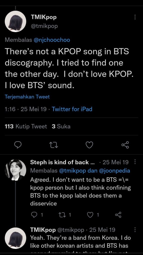 Di hari yang sama, akun @im_jammed memberikan tweet yang lebih terpercaya dan lebih masuk akal. Penulis bukan Big 3 stan. Tapi melihat pertempuran narasi ini, tentu kita bisa menduga mana yang akan ARMY percaya. Kalian mungkin bertanya, “kok bisa gitu ya?”. Selanjutnya akan saya bahas di Chapter 3.