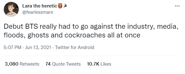 BTS sendiri pasti merasa sekeliling mereka bising tapi kemungkinan hanya gema dalam gua. Faktanya apa yang influencer BigHit dan die hard super fans lakukan adalah palsu. BTS dan ARMY bingung dan tidak dapat memahami seberapa populer mereka dan mengapa grup lain justru lebih dihargai, sementara mereka sangat menyadari bagaimana mereka diperhatikan dan disorot kamera.