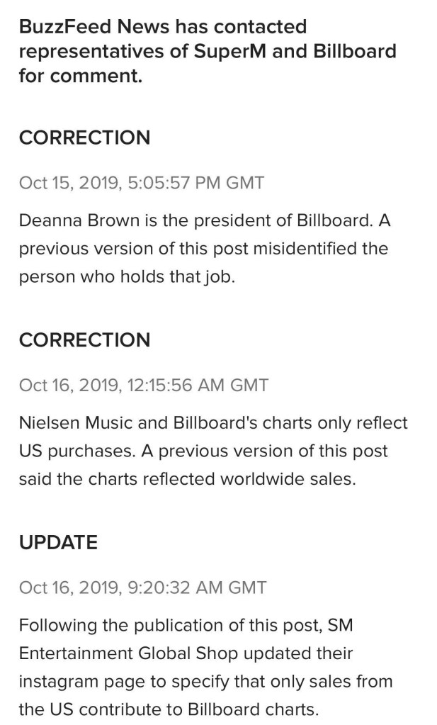 Billboard merilis pernyataan resmi dengan statistik Nielsen, membuktikan posisi grafik Super M sebagai sah , tidak ada dari dua penulis tersebut yang mengeluarkan permintaan maaf. Dan artikel tersebut masih ada di Buzzfeed — dengan tiga koreksi/update.