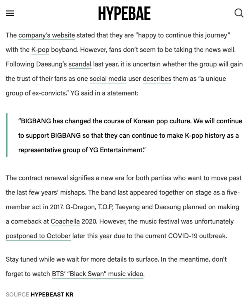 Pada 12 Maret, Pauline DeLeon menulis untuk HypeBae yang seharusnya merupakan terjemahan dari postingan situs Korea tentang BIGBANG yang ‘renewal’ kontrak rekaman mereka dengan label YG. Dalam artikel aslinya, DeLeon menulis “penggemar tampaknya tidak menerima berita [perpanjangan kontrak] dengan baik”, kemudian menambahkan tuduhan palsu terhadap anggota BigBang, Daesung, yang telah dibebaskan dan namanya dibersihkan secara hukum, dan mengutip ‘satu pengguna media sosial’ (khas propaganda, “netizen meributkan politisi blablabla”), dan memanggil Grup Bigbang sebagai “kelompok mantan narapidana yang unik”.